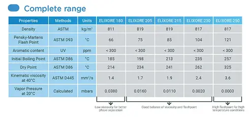 - Libre de aromáticos, el Elixore es inerte a la oxidación y, por tanto, a la degradación.
